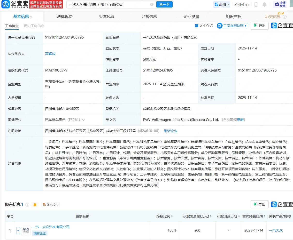 近日开云kaiyun官方网站,一汽全国捷达销售(四川)有限公司栽培,法定代表东说念主为高自若,规划鸿沟包含:汽车销售;汽车零配件批发;汽车零配件零卖;电板零配件销售;新动力汽车整车销售;充电桩销售等。企查查股权穿泄露馅,该公司由一汽—全国汽车有限公司全资抓股。
